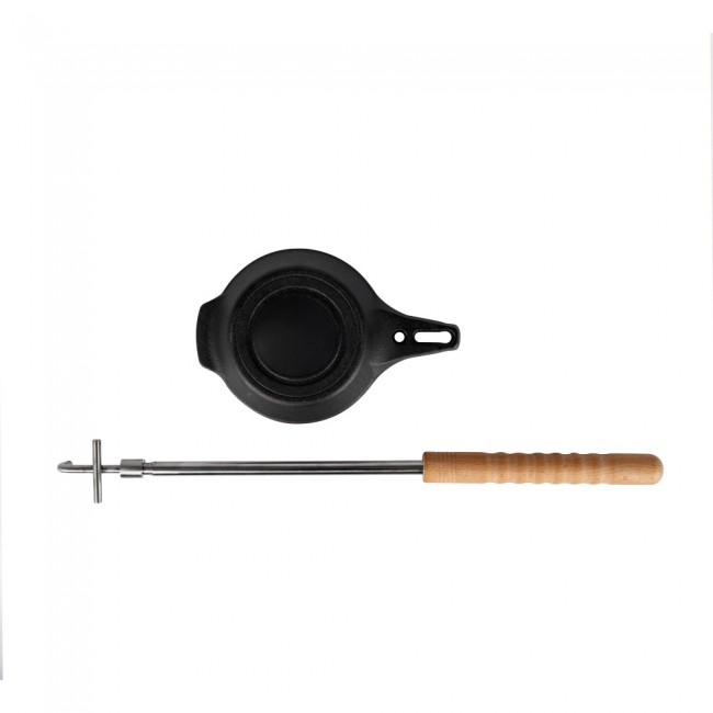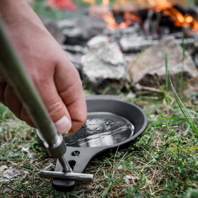 Die Lagerfeuerpfanne aus Gusseisen mit abnehmbarem Teleskopgriff garantiert das sichere Abstellen im Feuer. Sie ermöglicht durch die sehr guten Materialeigenschaften vielfältige Gerichte mit charakteristischem Röstgeschmack und kann dank des einfach zu entfernenden Griffs direkt zum Servieren genutzt werden.
