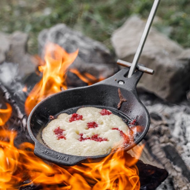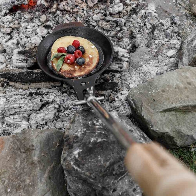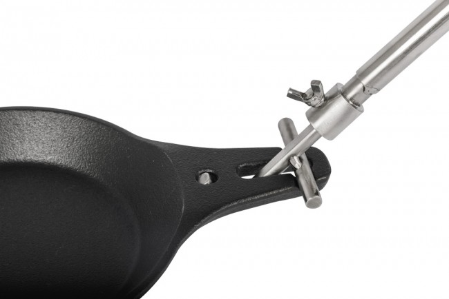 - die Pfanne fürs Lagerfeuer: mit abnehmbarem, verstellbarem Griff zum Positionieren im Feuer