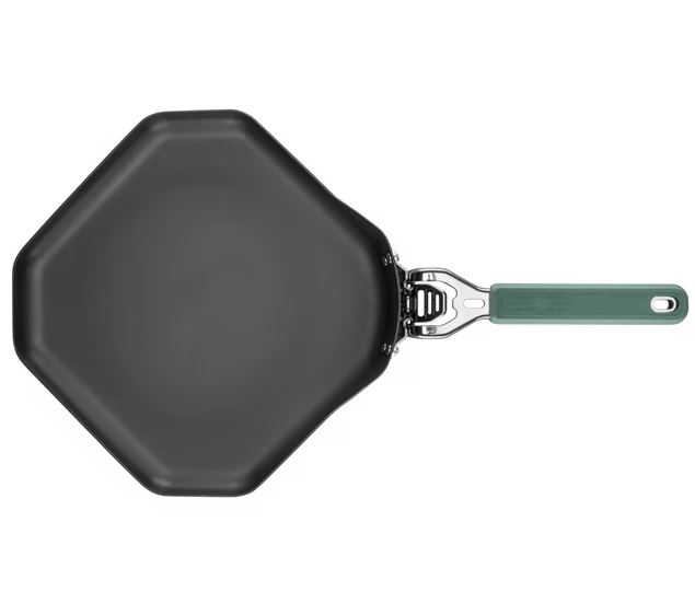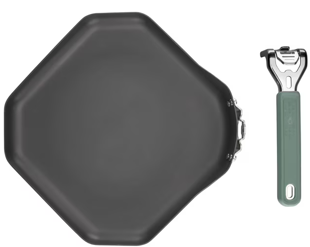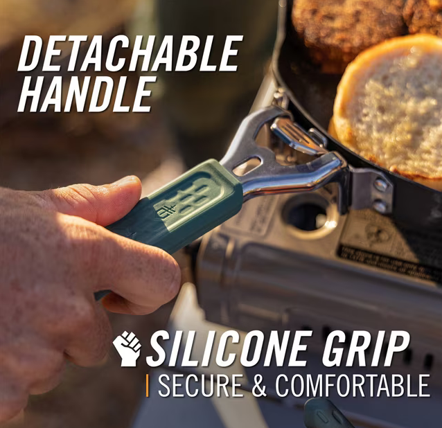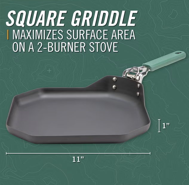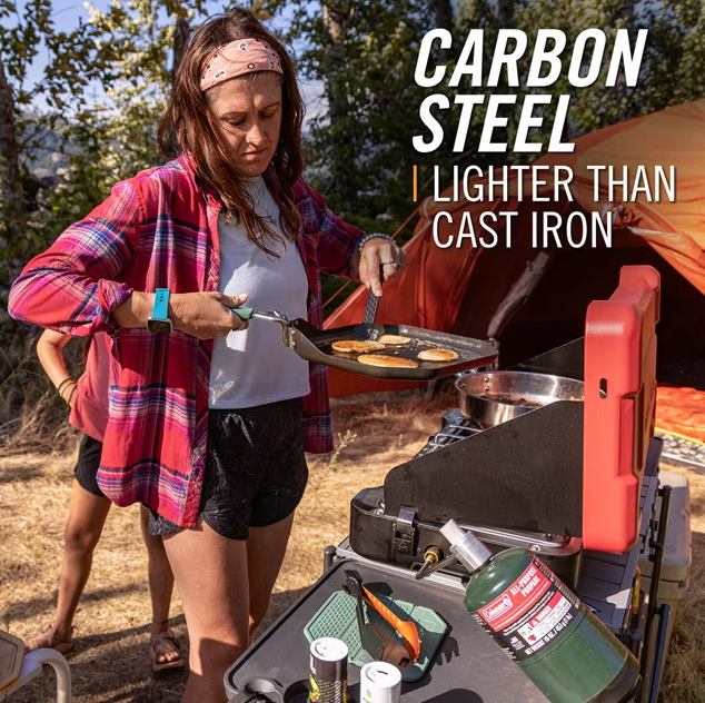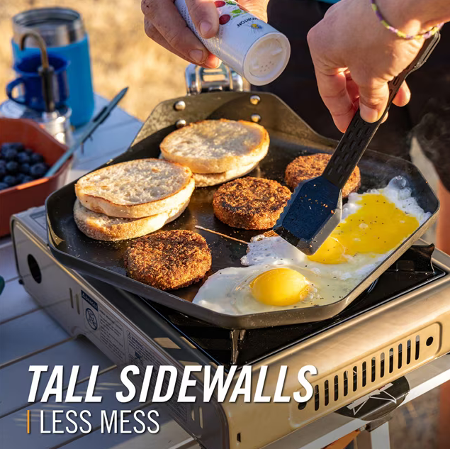 Die Compleat Griddle wird garantiert Ihr neuer, antihaftbeschichteter Favorit für den Campingplatz. Diese rechteckige Camping-Grillpfanne besteht aus Kohlenstoffstahl und bietet die gleichen langlebigen Antihaft-Eigenschaften wie Gusseisen, jedoch ohne das Gewicht. Die quadratische Form maximiert die Kochfläche und die hohen Seitenwände halten das Essen sicher in der Pfanne. Der mit Silikon beschichtete, abnehmbare Griff liegt angenehm in der Hand und lässt sich leicht abnehmen, was das Packen zum Kinderspiel macht.