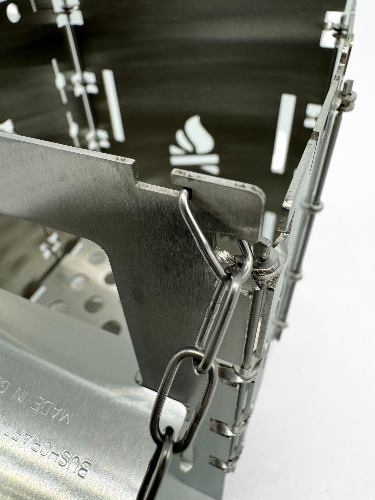 - Mit der angebrachten Kette kannst Du den gewünschten Neigungswinkel einstellen, indem Du sie auf beiden Seiten oben in die Nut für den Universalrost einhakst. Je länger und schwerer Deine Holzstücke sind, desto steiler sollte der Neigungsgrad sein (sprich: desto kürzer die Kette), damit das Holz zuverlässig nachrutscht und die Bushbox stabil steht (und nicht aus Versehen kippt).