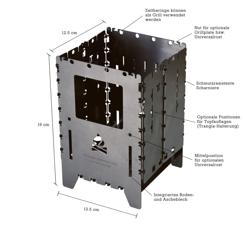 Unsere Bushbox XL in der extraleichten Titan-Ausführung! Nur 490g schwer (540g mit Tasche). Packmaß (zusammengelegt in der Tasche): 21 x 17 x 1 cm (ohne Tasche 19 x 12,5 x 1 cm). Die thermisch besonders belasteten Teile (Bodenblech, Topfauflagen) sind aus Edelstahl. Die Bushbox XL Titanium wird komplett mit unserer strapazierfähigen Outdoor-Tasche geliefert.