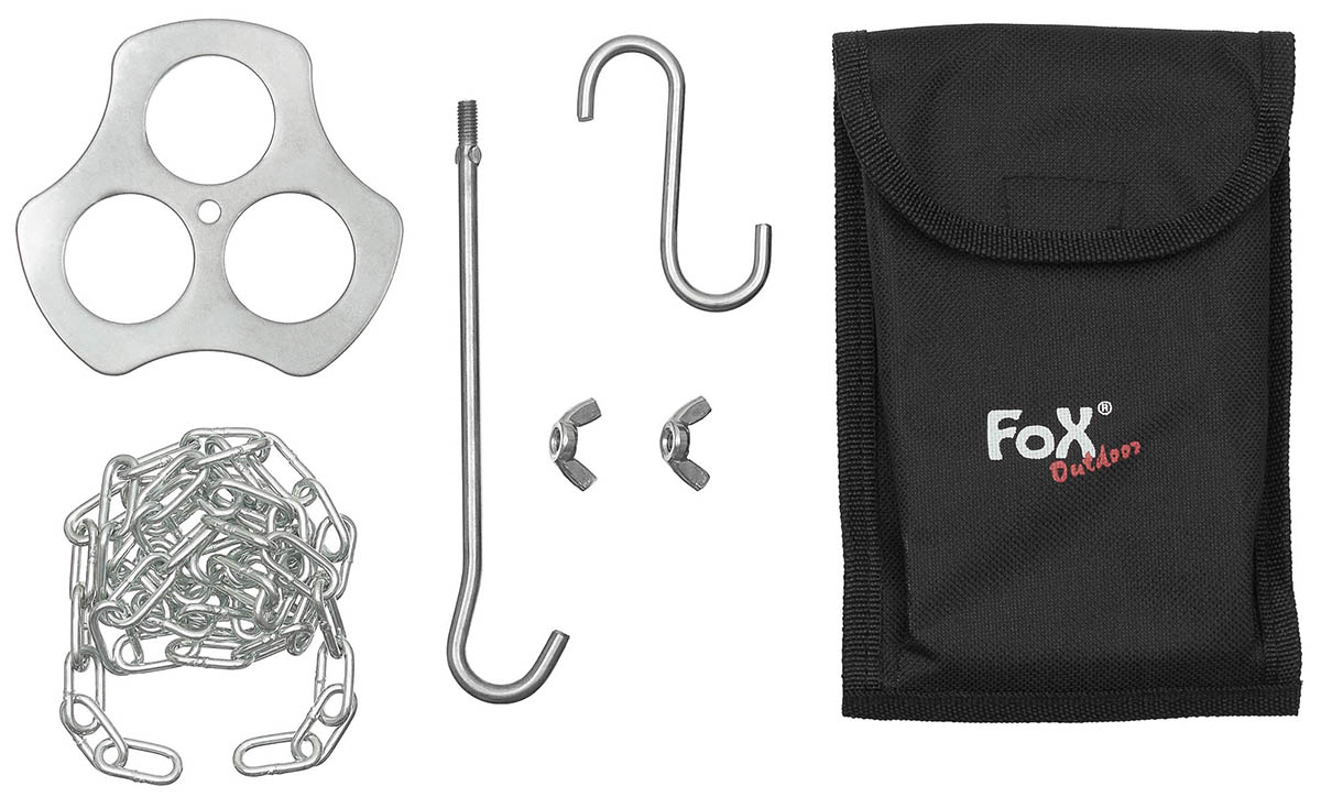 für den schnellen, einfachen Bau eines Dreibeins passend für Stangen, Äste etc. mit Durchmesser bis max. 3,5 cm Kette ca. 100 cm Schraubhaken mit Mutter S-Haken Transportbeutel mit Gürtelschlaufe Packmass: ca. 17 x 11,5 x 3,5 cm Masse Platte: ca. 10 x 10 cm Gewicht mit Zubehör: ca. 330 g