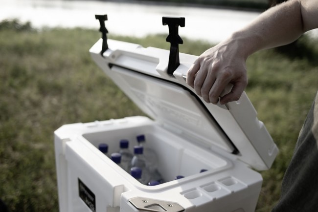 Am Deckel der Kühlbox vorgesehene Gurtführungen machen den Transport auf dem Boot oder der Ladefläche ohne weiteres möglich. Die seitlich angebrachten ergonomischen Tragegriffe dienen der optimalen Handhabung und garantieren komfortables Tragen selbst bei voller Befüllung der Kühlbox. Gleichzeitig können die Griffe als Verzurrpunkte genutzt werden – so ist die Kühlbox auch während des Transportes sicher befüllbar. Zwei belastbare Gummiverschlüsse machen das Öffnen und Verschliessen der Kühlbox auch mit nassen Fingern oder einhändig möglich. Ausserdem lässt sich der Inhalt über die verstärkten Verschlussplatten mit einem Bügelschloss vor fremdem Zugriff schützen. Vier Standfüsse geben auch auf rutschigem Untergrund Halt und sorgen dazu für eine beständige Luftzirkulation an der Unterseite.