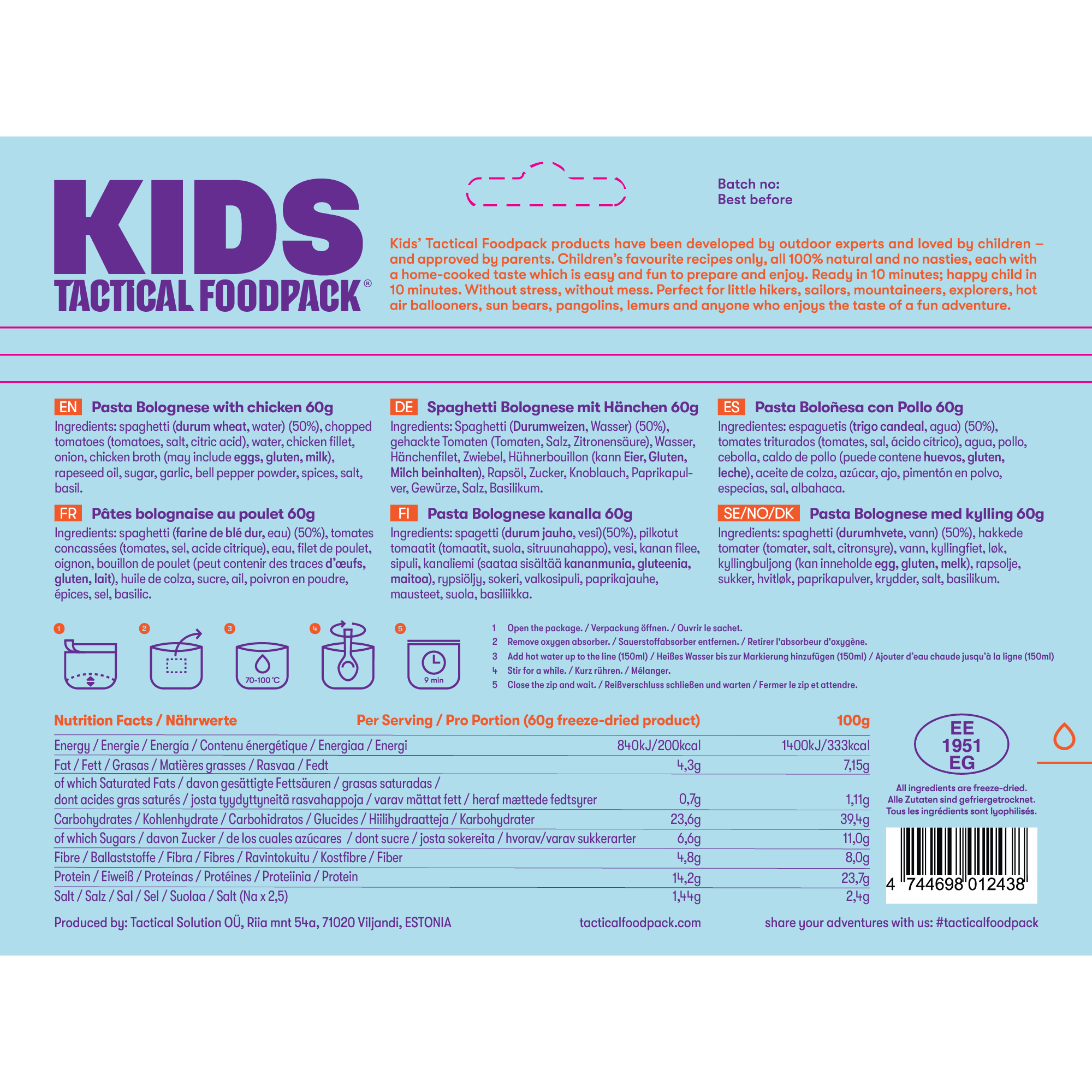 Die Produkte von Kids'Tactical Foodpack wurden von Outdoor-Experten entwickelt und von Kindern geliebt - und von Eltern genehmigt. Ausschließlich Lieblingsrezepte und -snacks von Kindern, alle 100 % natürlich und ohne schädliche Stoffe, jedes mit einem hausgemachten Geschmack, der einfach und mit Spaß zuzubereiten und zu genießen ist. Fertig in 10 Minuten; glückliches Kind in 10 Minuten. Ohne Stress, ohne Unordnung. Perfekt für kleine Wanderer, Segler, Bergsteiger, Entdecker, Nicht-Luftballonfahrer, Sonnenbären, Schuppentiere, Lemuren und alle, die den Geschmack eines lustigen Abenteuers genießen wollen.
