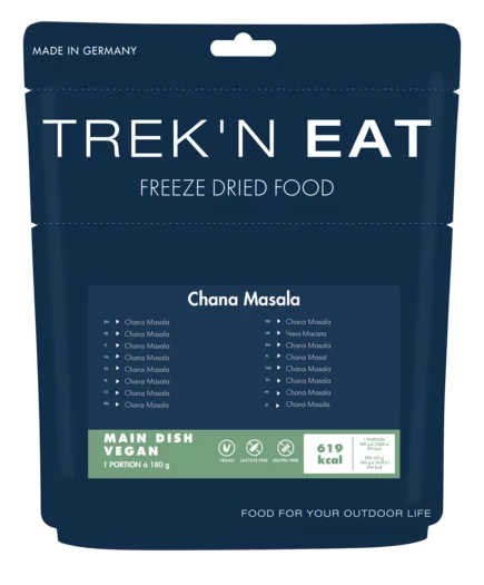 Trek’n Eat bringt den Geschmack Indiens in den Topf. Chana Masala ist ein klassisches Gericht aus Indien und Pakistan, das hauptsächlich aus Kichererbsen besteht. Kichererbsen gehören zur Gattung der Bohnen. Sie sind besonders eiweisshaltig und zeichnen sich durch einen hohen Anteil an Kohlenhydraten aus. Mineralstoffe wie Eisen, Magnesium und Zink sind reichhaltig vertreten und deshalb ist das Chana Masala bestens geeignet, um leere Speicher wieder aufzufüllen. Mit einer fein abgestimmten Würze wird die Hommage an Indien im Trek’n Eat Chana Masala perfekt.