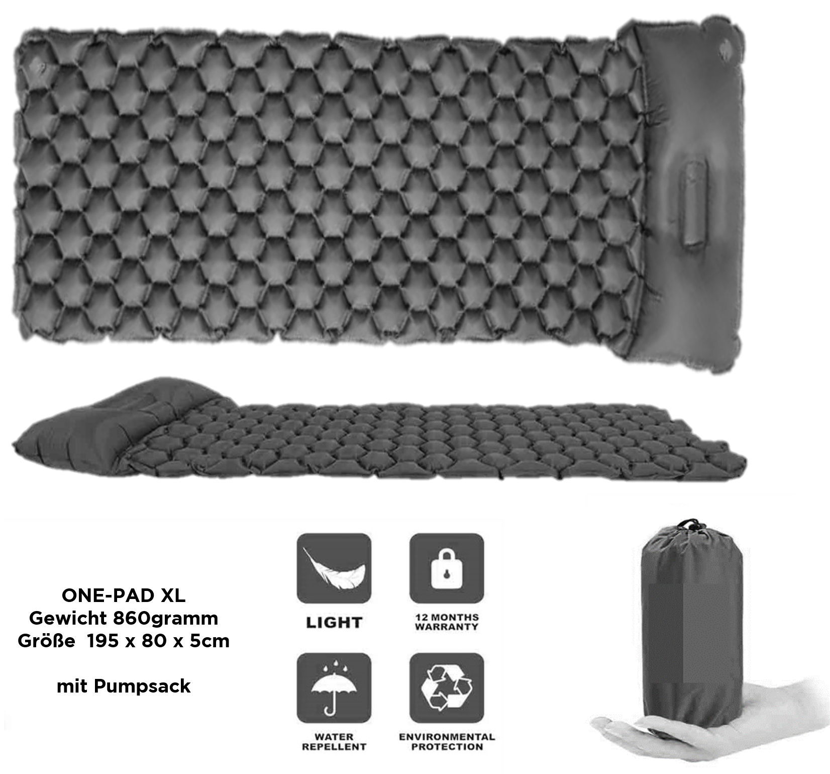 Das speziell für Disc-O-Bed entworfene ONE-Pad ist die zweite aufblasbare Luftmatratze in unserem Sortiment, als etwas günstigere Alternative zum Disc-Pad. Das integrierte Kopfkissen bietet zusätzlichen Komfort und die spezielle Wabenstruktur sorgt für optimale Druckverteilung.