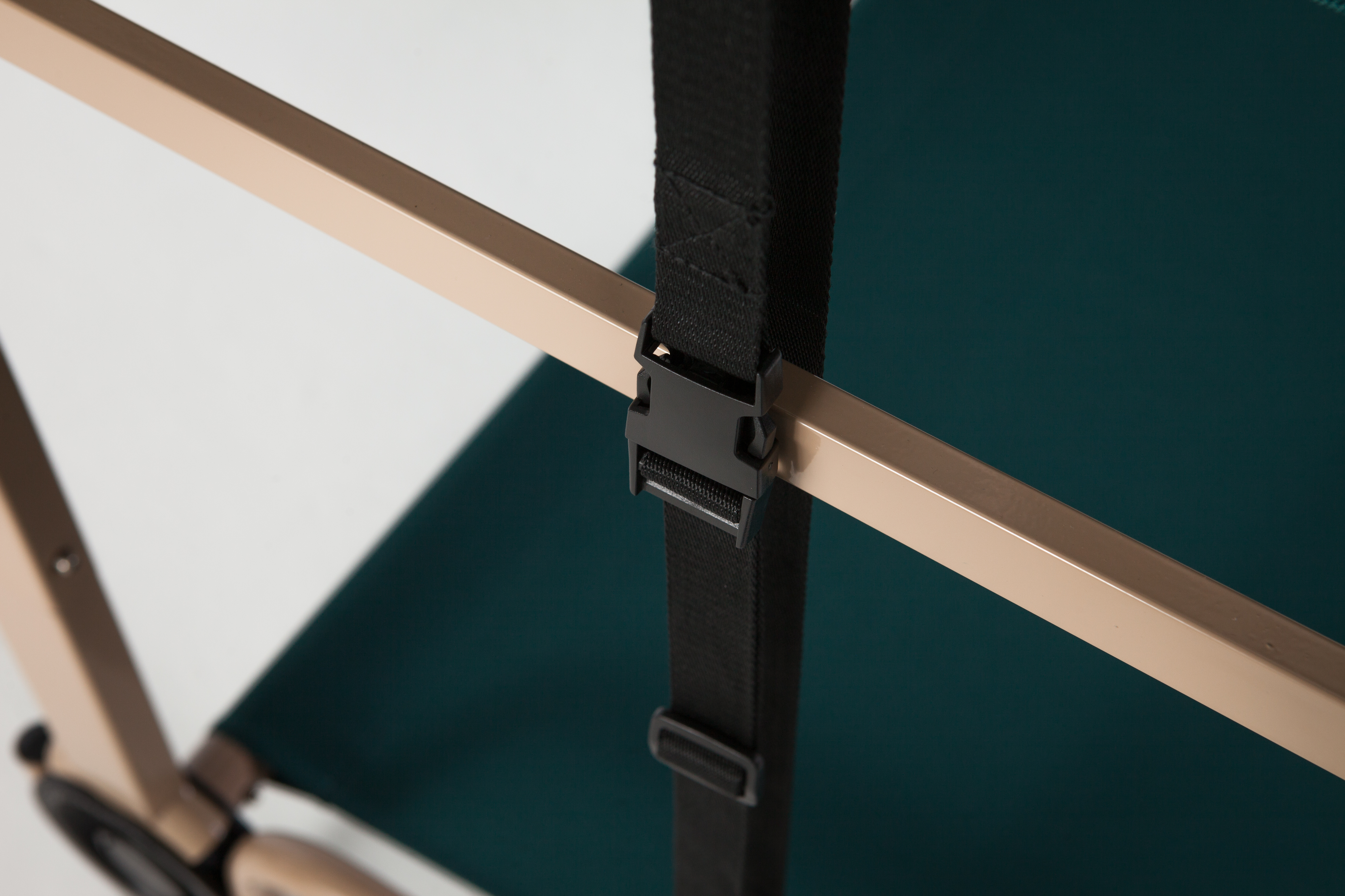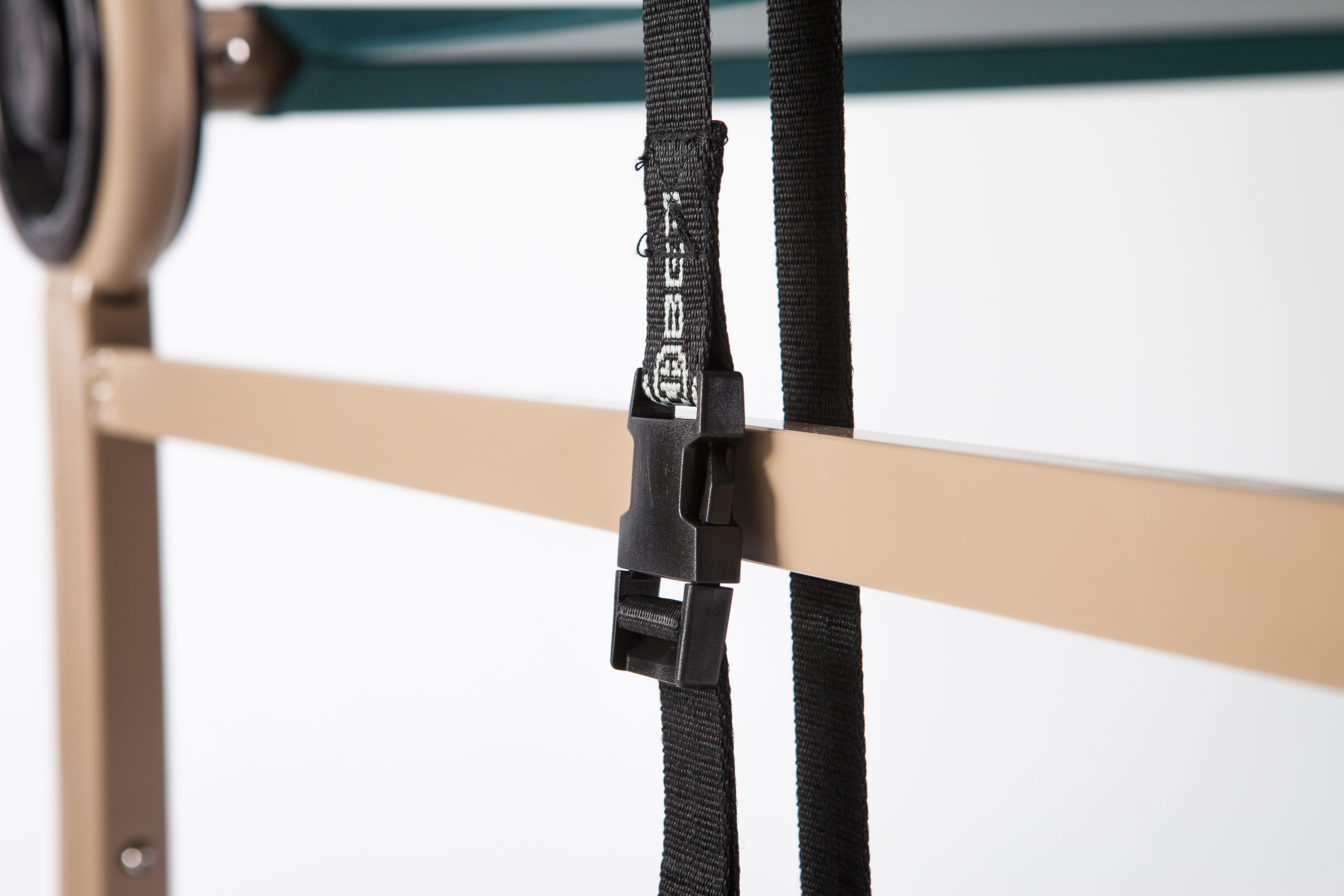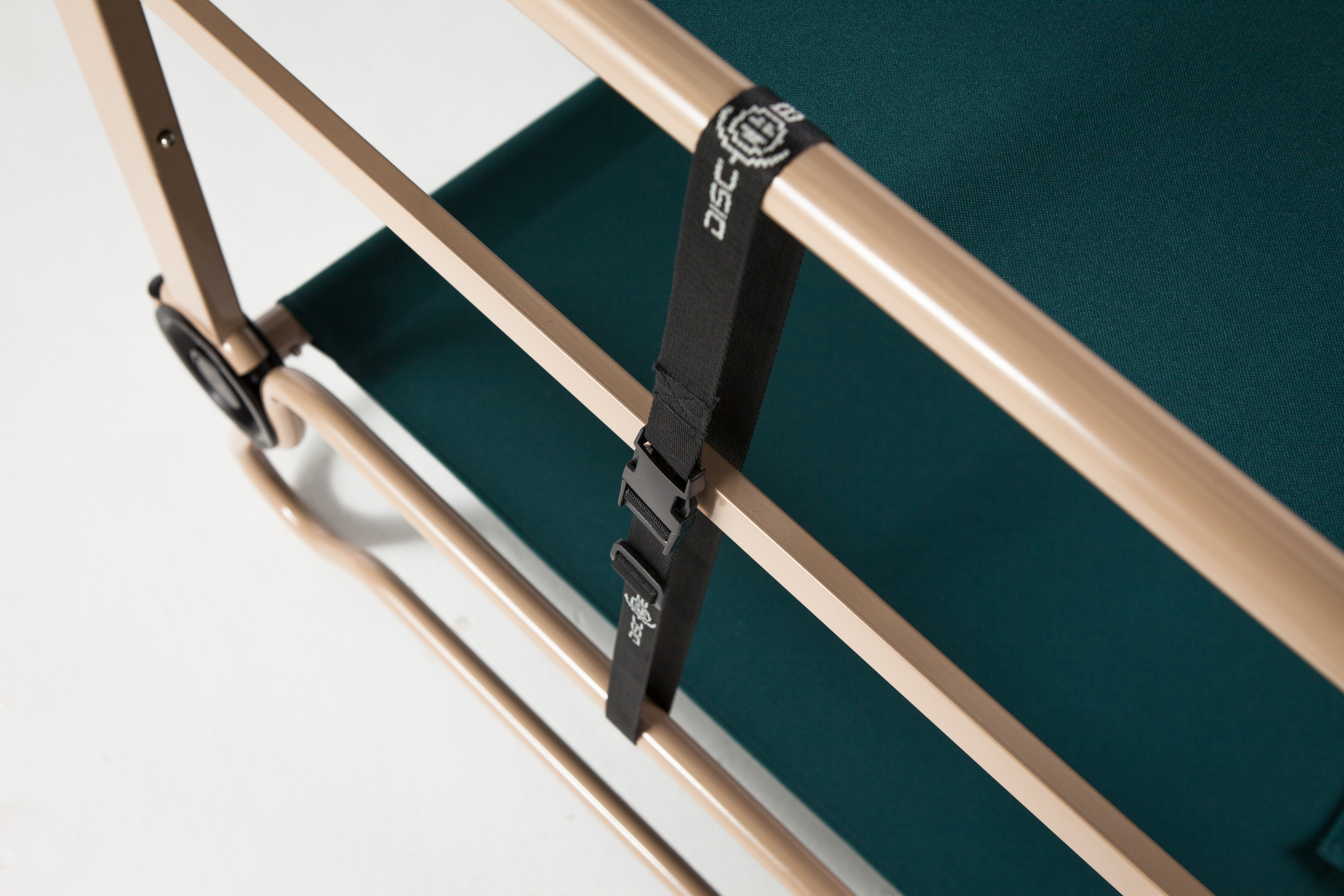 Machen Sie ihr Disc-O-Bed Single L zum Etagenbett. Die Stapeladapter werden einfach an den Beinen des Bettes mit geradem Rahmen angebracht, damit kann das obere Bett auf den Discs des unteren Betts aufgesetzt werden. Die Sicherheitsriemen sind sehr belastbar und bieten zusätzlichen Halt zwischen oberem und unterem Bett.