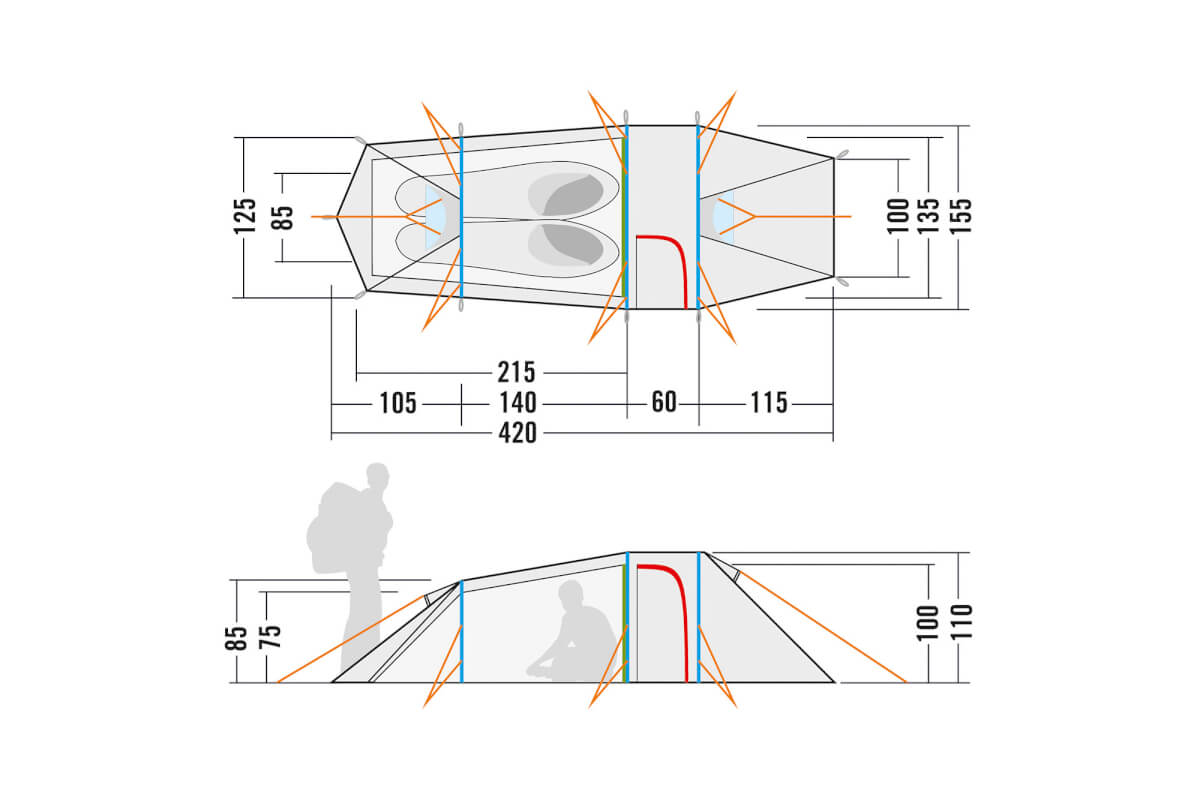 Das 2-Personen-Zelt wird mit drei Gestängebögen aus leichtem, bruchfestem Aluminium aufgestellt und in Längsrichtung abgespannt. Der verkürzte hintere Gestängebogen spart Gewicht ein. Das Tunnelzelt ist einfach aufzubauen, da Innen- und Außenzelt miteinander gekoppelt sind. Beim Zeltabbau unter widrigen Wetterverhältnissen kann das Innenzelt ausgehängt und trocken verstaut werden.