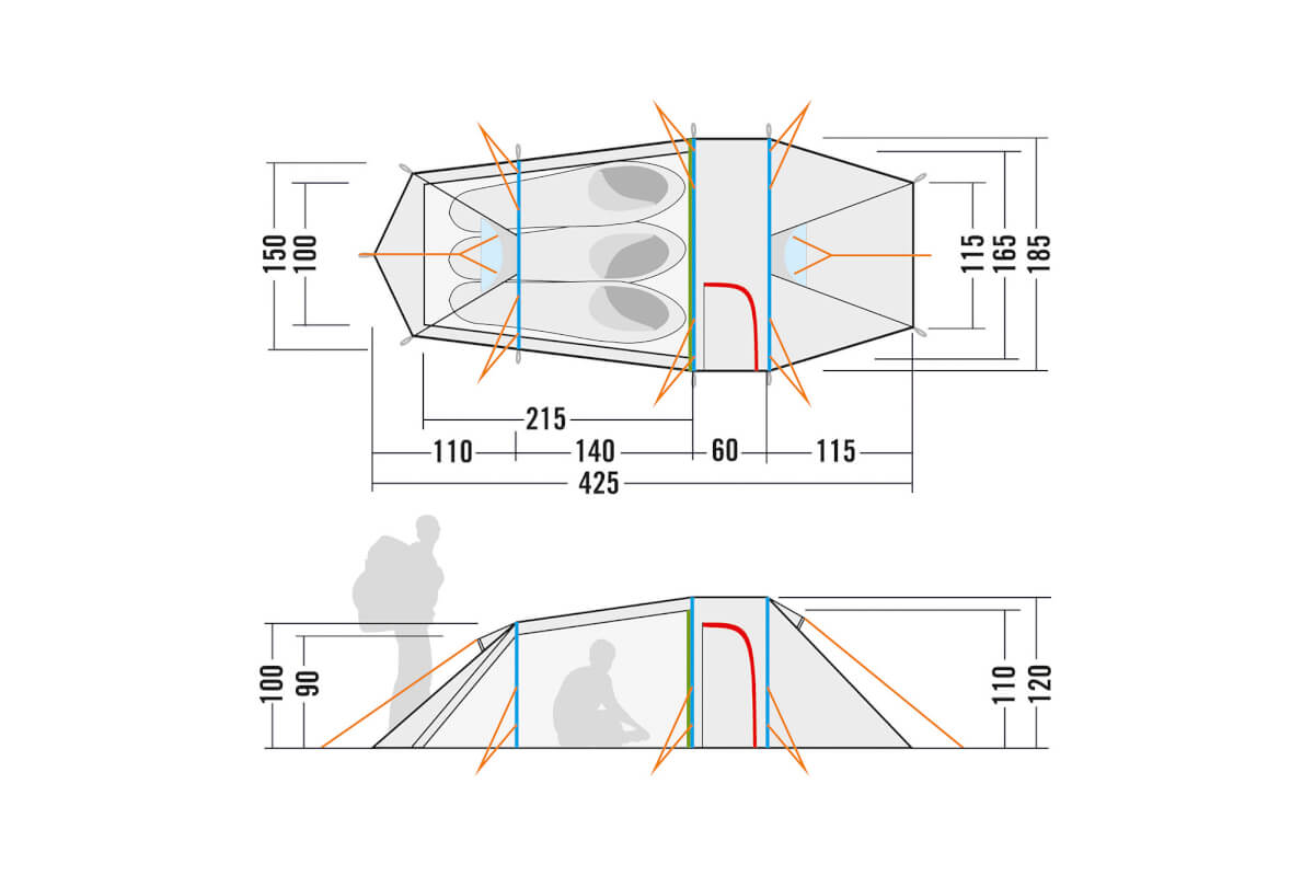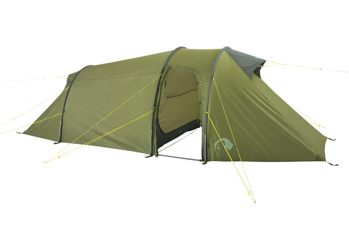 Das Tunnelzelt wird einfach und schnell samt Innenzelt mit drei Gestängebögen aufgestellt und in Längsrichtung abgespannt. Der verkürzte hintere Gestängebogen spart Material und Gewicht. Das Innenzelt lässt sich auch aushängen, um es bei Regen trocken zu verstauen.