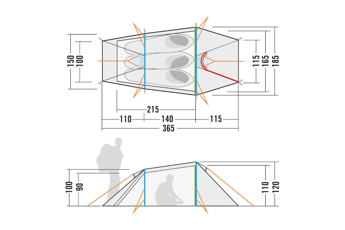 Da Innen- und Aussenzelt miteinander gekoppelt sind, werden sie ganz einfach gemeinsam aufgebaut. Soll das Innenzelt bei Regen trocken verstaut werden, lässt es auch aushängen. Die Tunnelkonstruktion ist, mit der Schmalseite zum Windrichtung ausgerichtet, sehr windstabil.