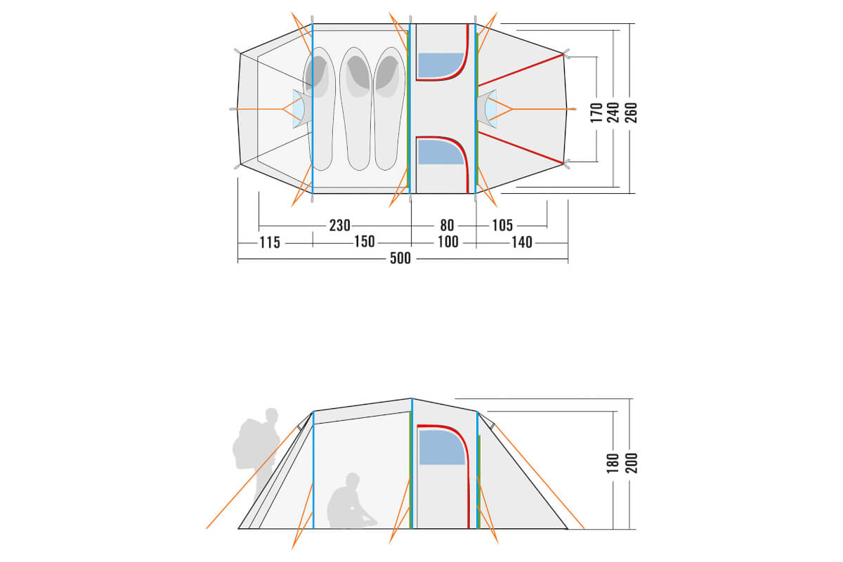 Das Tatonka Family Camp eignet sich für eine drei- bis vierköpfige Familie. Durch zwei gegenüberliegende Seiteneingänge gelangt man in die zwei Meter hohe Apsis. Ein dritter Eingang befindet sich an der Frontseite. Die Schlafkabine des 3-Personen-Zelts ist so großzügig bemessen, dass selbst vier Personen ausreichend Platz finden. Verschließbare Fenster in den Seiteneingängen und an den Stirnseiten sorgen für ausreichend Licht im Zelt.