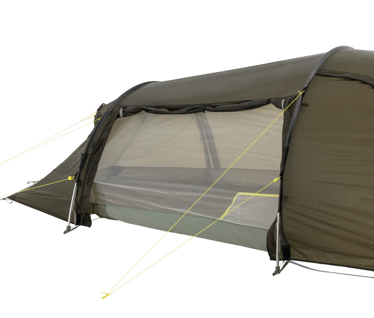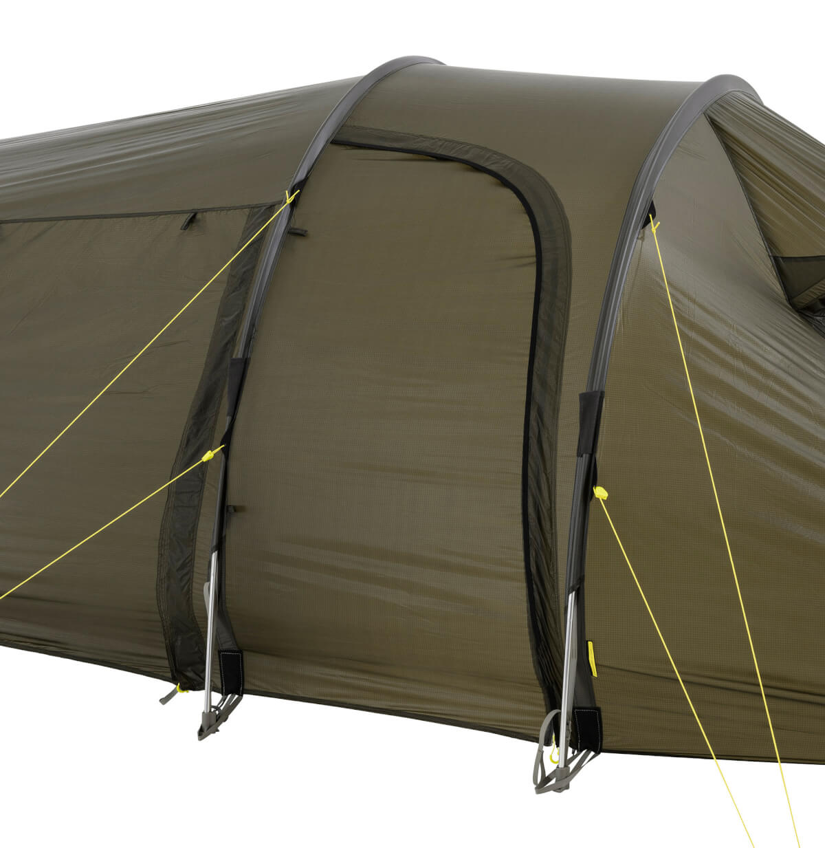 Das 2-Personen-Zelt wird mit drei Gestängebögen aus leichtem, bruchfestem Aluminium aufgestellt, der hintere Bogen ist verkürzt und spart dadurch Material und Gewicht ein. Durch die Koppelung von Innen- und Außenzelt gestaltet sich der Aufbau sehr einfach. Selbstverständlich kann das Innenzelt auch ausgehängt werden.