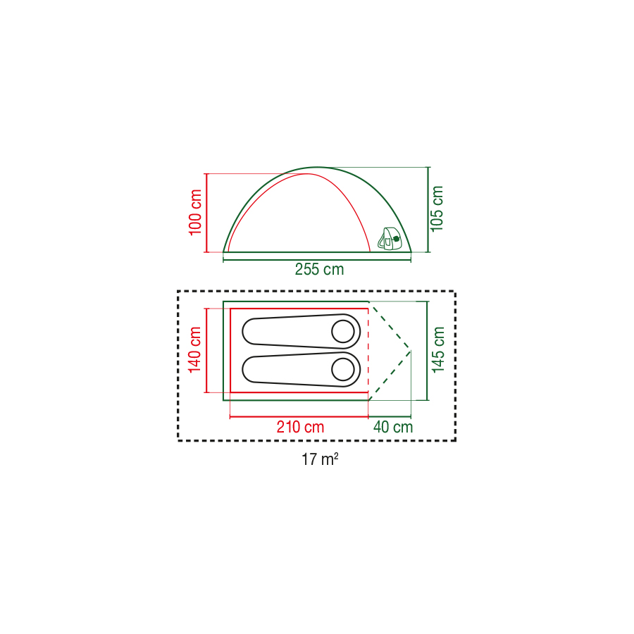 Außenzelt: 100 % Polyester, Ripstop Polyester 68 D 185 T, WS 3.000 mm PU-beschichtet, feuerhemmend, Nähte getaped