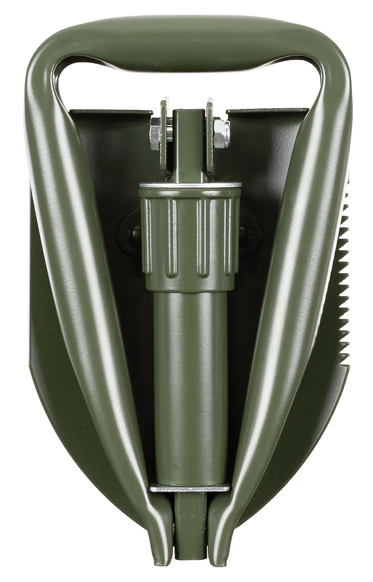 extra kompakter Klappspaten Griff und Spatenblatt aus robustem Stahl auch als Hacke verwendbar Blatt mit einseitiger Sägezahnung zusammenklappbar durch Drehverschluss Transporttasche mit Gürtelschlaufe Blattgrösse: ca. 15,5 x 11 cm Gesamtlänge: ca. 47 cm Packmass: ca. 20 x 13 x 5 cm Gewicht mit Tasche: ca. 680 g