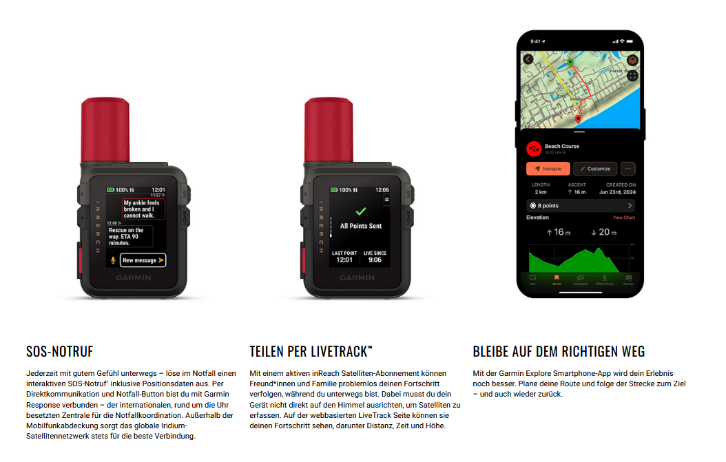 Dank globaler Abdeckung über das Iridium® Satellitennetzwerk kannst du selbst ohne Mobilfunkempfang Nachrichten versenden und im Notfall einen interaktiven SOS-Notruf an Garmin Response℠ absetzen.