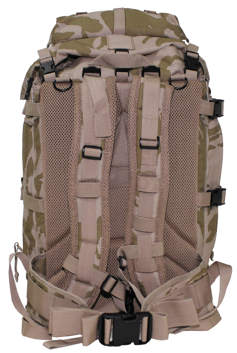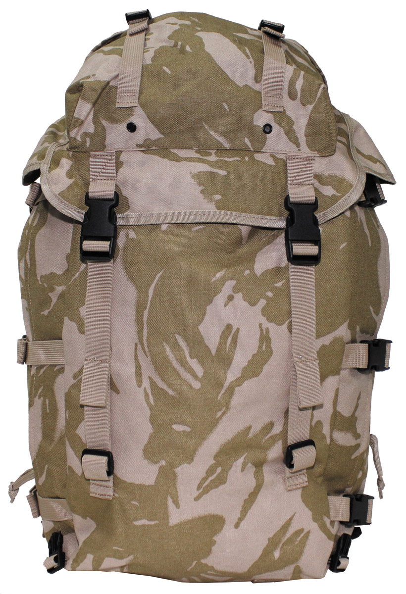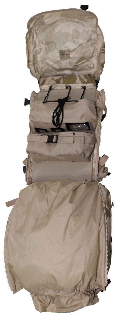 hochwertiger, robuster Kampfrucksack Original aus den Beständen der Britischen Armee NSN: 8465-99-241-6912 offiz. Bezeichnung: "Bowman Manpack Radio Carrier" besteht aus zwei separat tragbaren Hauptfächern verbunden durch RV und Druckknöpfe Deckel mit aufgesetzter Tasche, mit Click-Verschlüsse abnehmbar durchwegs YKK-RV hinteres Fach mit div. Befestigungen für Funkgerät vorderes Fach (ca. 40L) mit grossem Stauraum 2 Kordelzüge mit Stopper oben li & re seitl. RV zur Aufnahme v. weiteren Taschen z.B. Art-Nr.: 630360 hinten und seitliche diverse Clickverschlüsse für weitere Befestigungsmöglichkeiten gepolsterter, verstellbarer Tragegurt zusätzlich abnehmbarer und verstellbarer Brustgurt verstellbarer Beckengurt mit Molleschlaufen gepolsteter Rücken mit Meshgewebe
