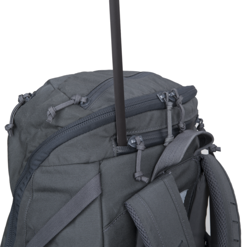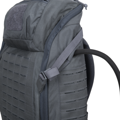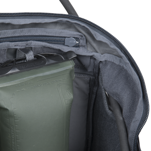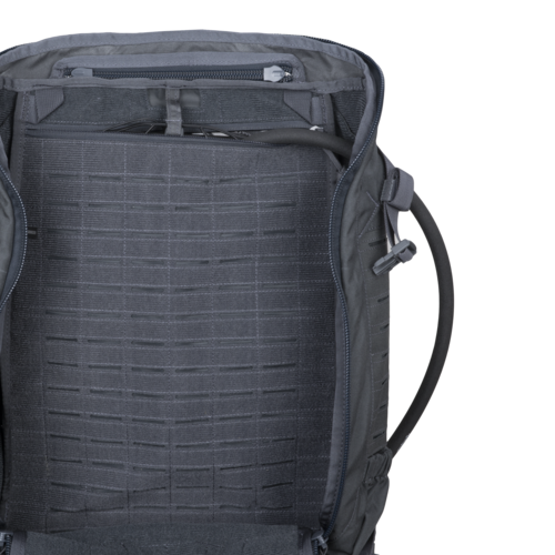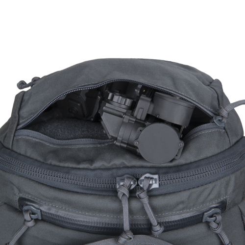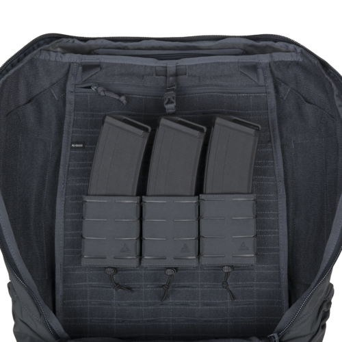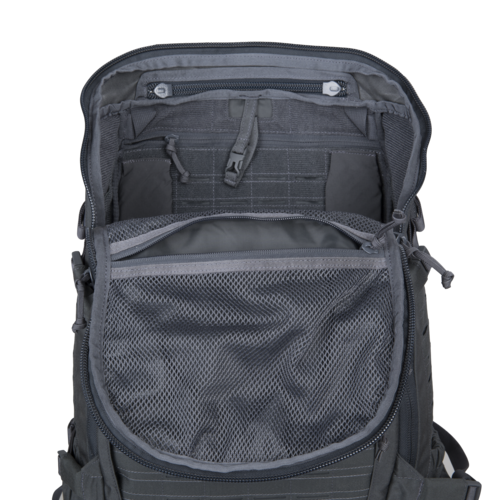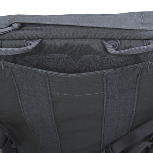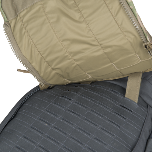 Er verfügt über ein großes Hauptfach, das mit YKK® #10 Reißverschlüssen verschlossen wird. Das Innere ist mit Veloursstoff ausgekleidet, wodurch zusätzliche Taschen befestigt werden können. Die Rückwand des Innenraums ist mit lasergeschnittenem MOLLE/PALS versehen, sodass der Rucksack je nach Bedarf als Sanitätsrucksack, Sturmrucksack, Sprengmeisterrucksack oder Funkrucksack mit internen Befestigungspunkten umgerüstet werden kann.