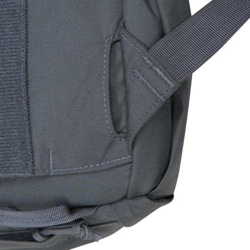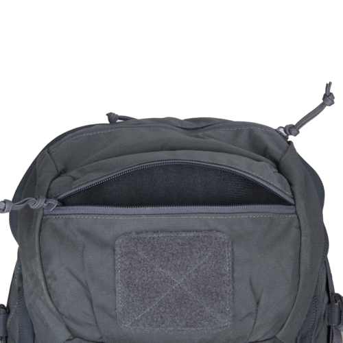 Im oberen Bereich der Deckelklappe befinden sich zwei zusätzliche Taschen, von denen eine mit Veloursstoff ausgekleidet ist. Die Außenseite des Rucksacks ist ebenfalls mit lasergeschnittenem MOLLE/PALS bedeckt.