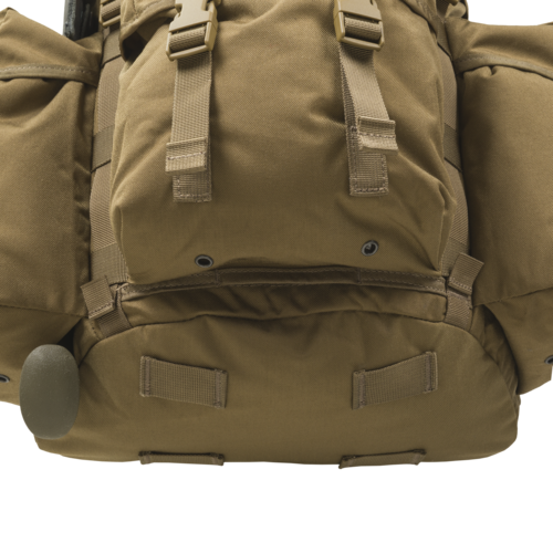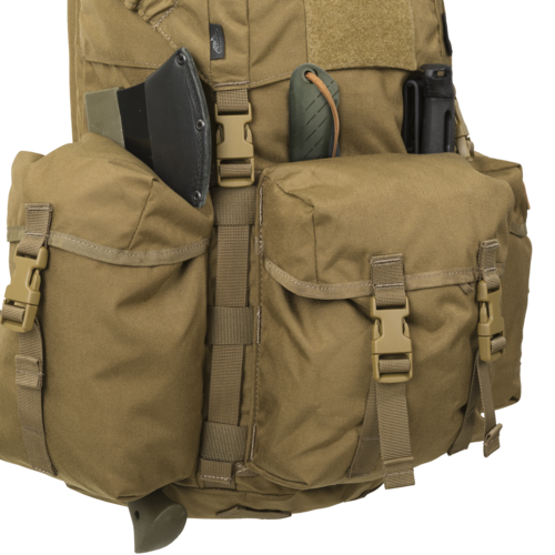 Alle Taschen sind mit Kordelzug und Deckelklappen ausgestattet, die mittels Fastex-Schnallen sicher verschlossen werden. Oberhalb der Taschen befindet sich eine durchgehende MOLLE/PALS-Schlaufe, an der zusätzliche Ausrüstung wie Handschuhe oder Zusatztaschen befestigt werden kann. Alternativ lässt sich das MOLLE-System mit einer Stoffklappe abdecken, um einen klassischen Bushcraft-Look zu erhalten.