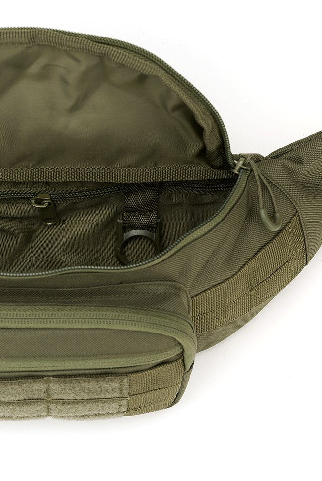 großes Hauptfach mit Reißverschluss-Innenfach und Schlüsselhaken / Frontasche mit Zusatzfach / Klettverschlussfach hinten / Deckelfach mit elastischem Kreuzgurt / MOLLE Schlaufen / MOLLE Schlaufen mit Klettfläche / Reißverschlüsse mit C Ring / robustes 600D Polyester / verstellbarer Hüftgurt / Umfang max: 170 cm