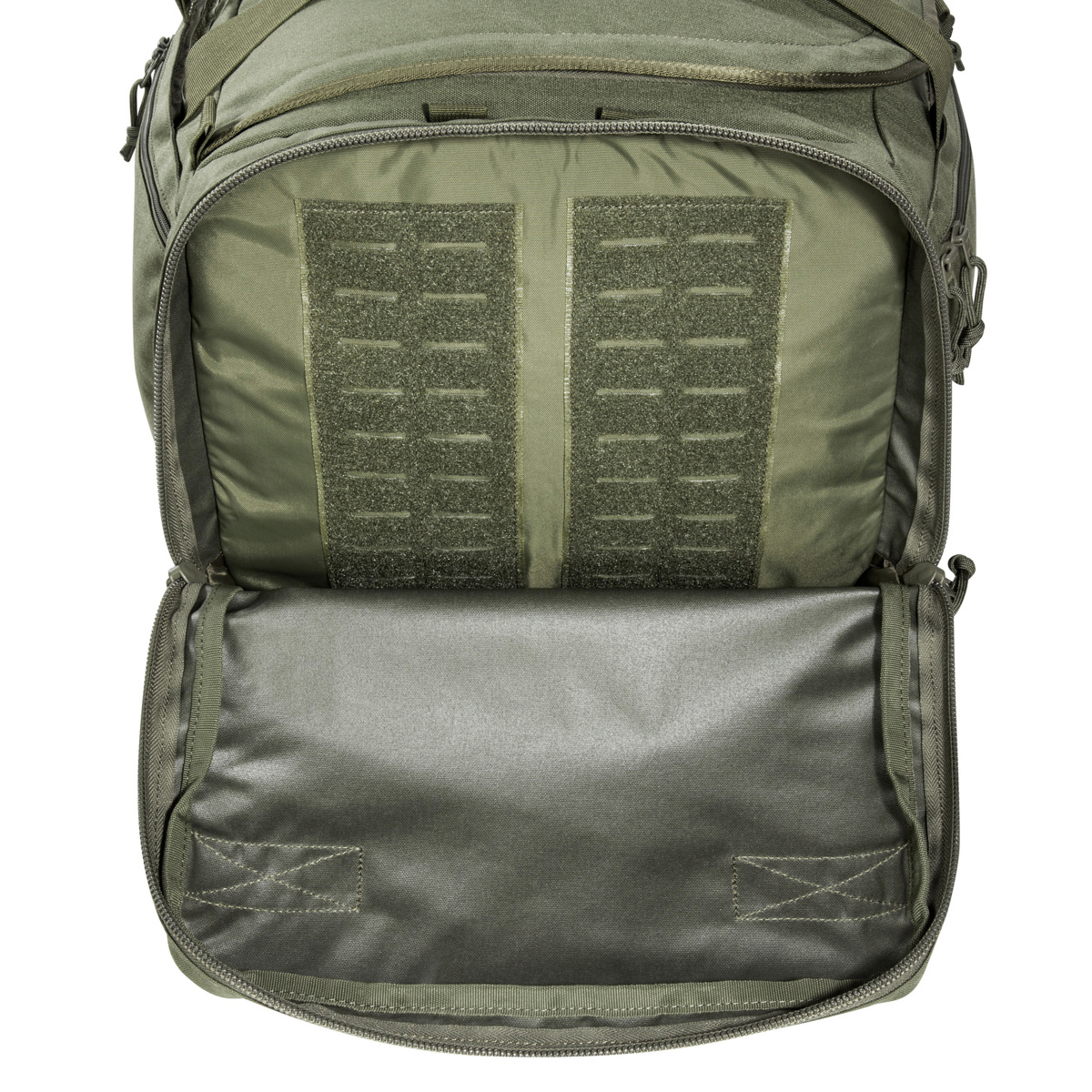 Die TT Officers Bag besitzt neben dem Hauptfach an jeder Stirnseite eine Seitentasche. Eine davon ist mit einem Doppelreißverschluss versehen, um eine IFAK-Tasche für den Schnellzugriff unterzubringen, die andere ist mit MOLLE-Klett ausgestattet. Auch die Stirnseite des Hauptfachs ist mit MOLLE-Klett belegt. Das Hauptfach der Tasche besitzt abschließbare Reißverschlüsse. Die Tragegriffe lassen sich verstauen, und die Tasche kann bei Bedarf mit gepolsterten Rucksack-Schultergurten versehen werden. Diese sind im Deckel in einer Reißverschlusstasche verstaut.