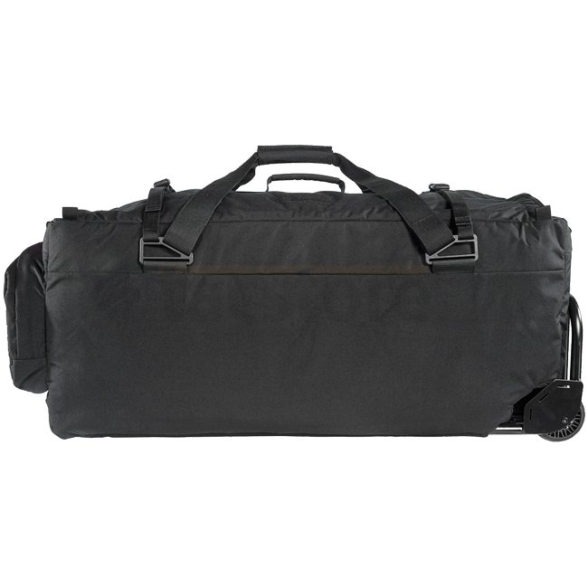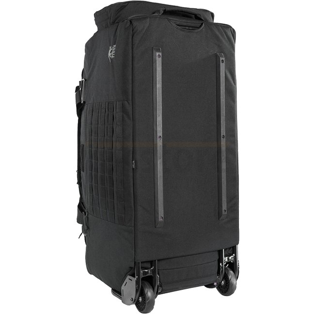 Der Trolley besitzt eine große Kofferöffnung zum leichten Beladen. Auf der Außenseite befinden sich zwei Reißverschlusstaschen, außerdem ein MOLLE-System.