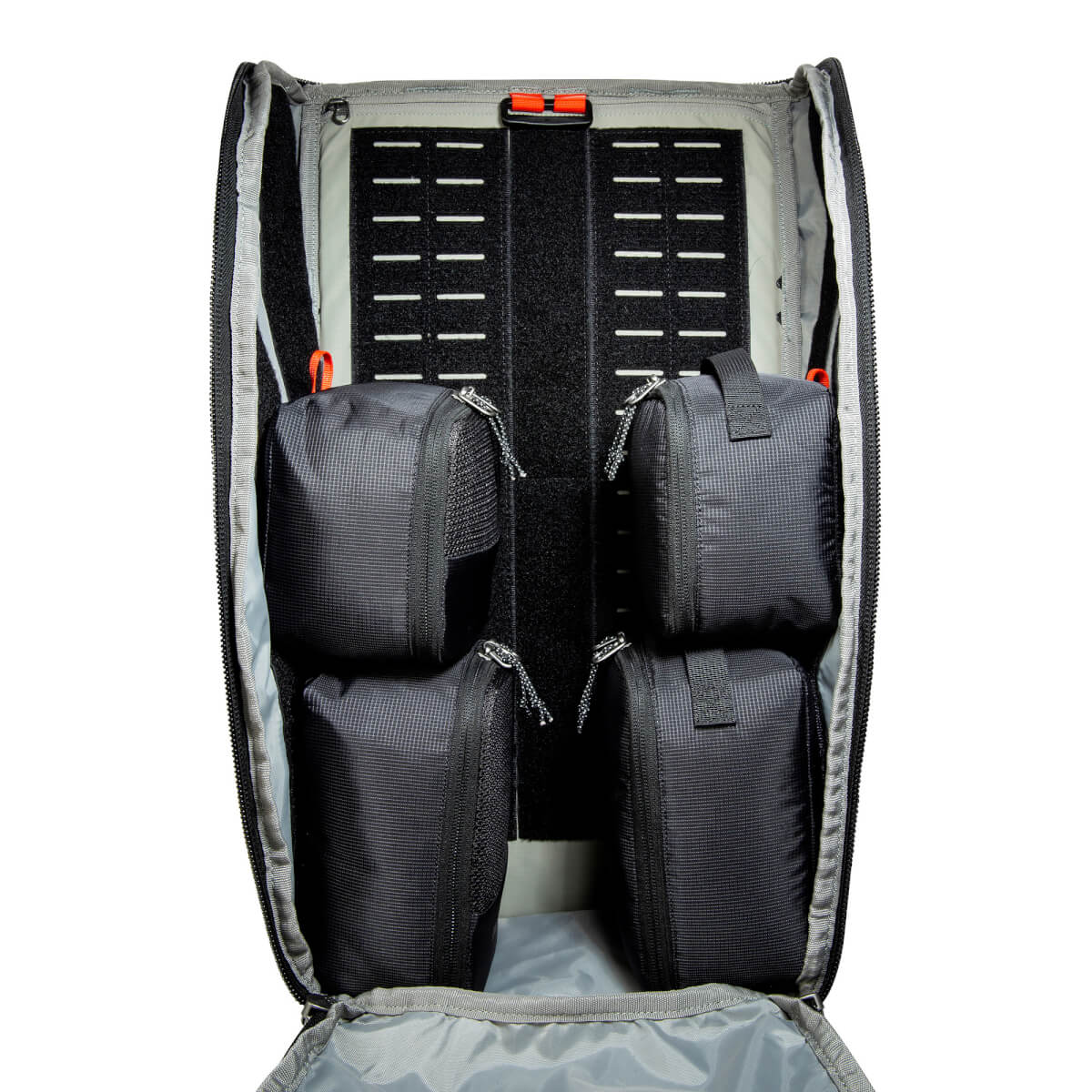 Das EDC Organisation Set von Tatonka besteht aus zwei gepolsterten Aufbewahrungstaschen, zwei Netztaschen mit Reißverschluss und zwei Kompressionsriemen. Alle Teile können in Rucksäcken angeklettet werden, die mit Klettflächen ausgestattet sind.