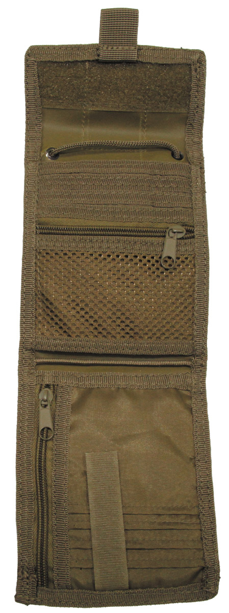 komplett aufklappbar mit Klettverschluss 2 Einschubfächer mit Sichtfenster vorne versenkbares Nackenband mit Kordelstopper 8 Einschubfächer für Karten, Führerschein, usw. 2 Innentaschen mit Reissverschluss Deckel mit Klettflauschpatch ca. 9 x 5 cm 1 Einschubfach aussen mit Klett und 1 Schlaufe 4 elastische Schlaufen hinten Masse offen: ca. 12 x 38 x 0,5 cm (B x H x T) Masse geschlossen: ca. 12 x 15 x 1,5 cm